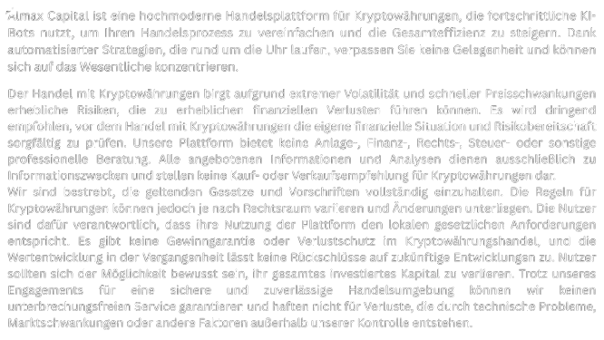 Heute gilt Almax Capital als Schnittstelle zwischen professionellem Trading und modernster Kryptoanalyse. Das Projekt verbindet das Wissen der „Marktwale“ mit den Bedürfnissen privater Investoren und bietet damit eine völlig neue Art der Interaktion im digitalen Finanzsektor. Unsere Mission ist es, jedem Nutzer – vom Einsteiger bis zum institutionellen Investor – den Zugang zu hochwertigen Analysen, sicheren Investitionen und verlässlichen Strategien zu ermöglichen.